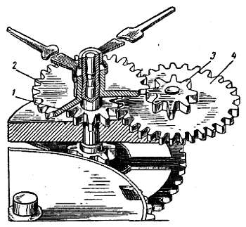 В зубчатой передаче часового механизма имеются ведущие и ведомые элементы.