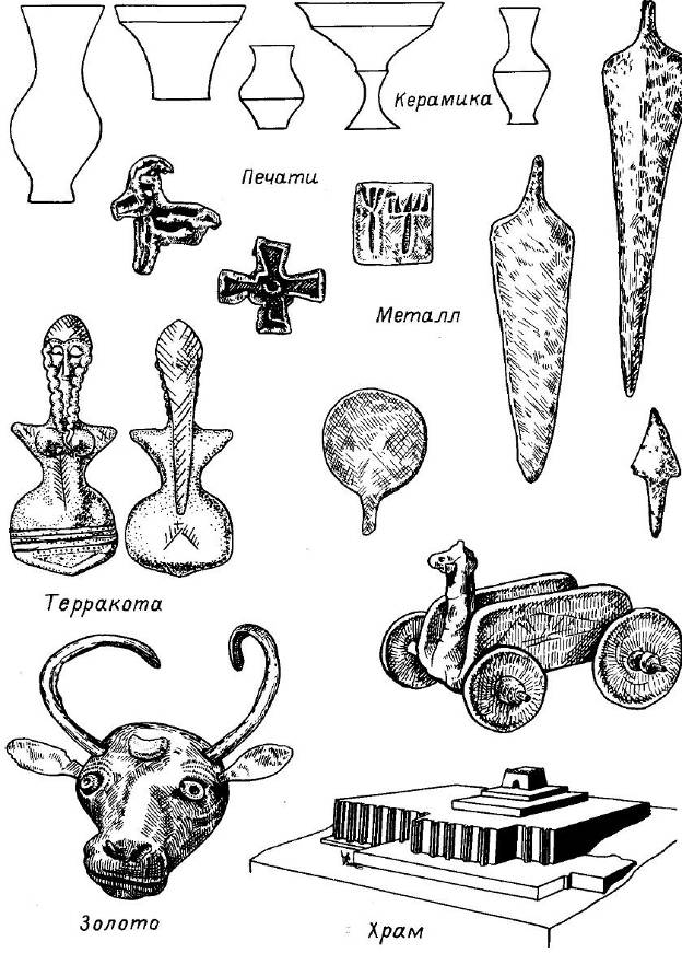 О развитии металлообработки свидетельствует уже само разнообразие металлических предметов. Рубящие орудия представлены массивными теслами, одно целое тесло имеет две цапфы. К режущим орудиям относятся однолезвийные и двулезвийные ножи с небольшим черешком для насадки рукояти. Наиболее типичны ножи с клинком листовидной формы. Подтреугольные наконечники стрел имеют небольшой черешок. Сохраняются и кремневые наконечники стрел, но, как показал их трасологический анализ, в большинстве своем они использовались как сверла при изготовлении каменных сосудов. Известен бронзовый серп с рабочим лезвием, расположенным под прямым углом по отношению к рукояти. Из предметов туалета могут быть отмечены овальные зеркала с боковой ручкой, височные кольца, браслеты, бронзовые и серебряные кольца. Отдельную группу изделий представляют длинные стрежни-булавки, появившиеся еще в позднем энеолите, где их навершие обычно имело форму лопаточки. Теперь среди наверший отмечены также спираль, полулунье и головки копытных животных. Возможно, эти изделия имели двойную функцию — использовались при креплении одежды и одновременно являлись атрибутами лиц особого социального положения. Из золотой проволоки делались перстни и бусы, причем нередко на алебастровую основу накладывали золотую фольгу.