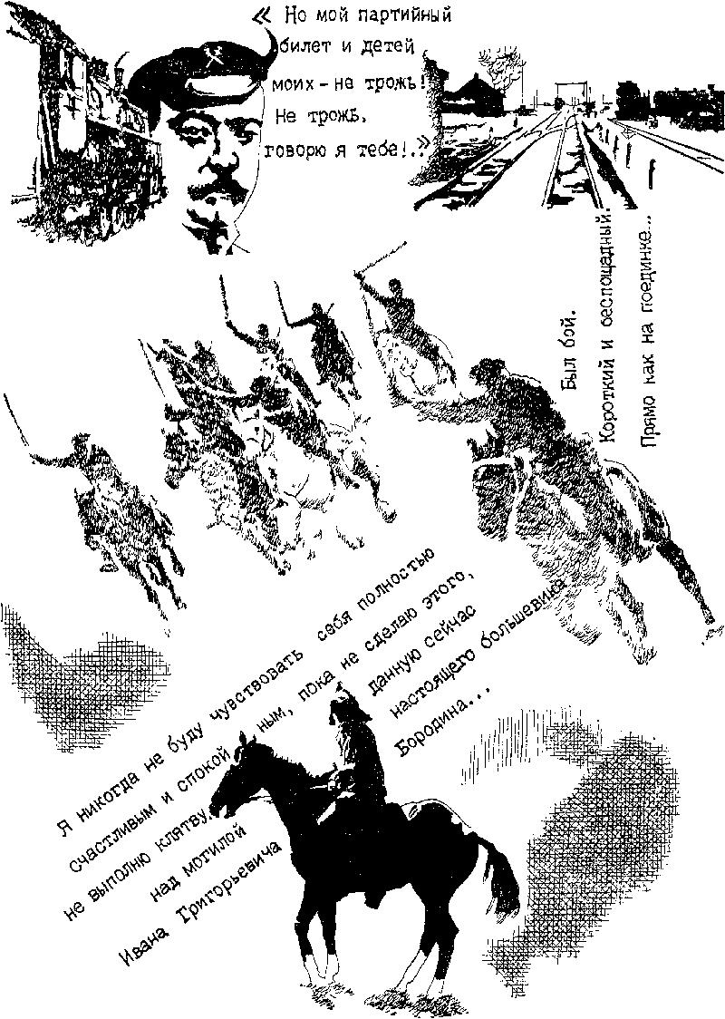 Рассказ Михейкина потряс меня до глубины души. На царской каторге, на фронте мне не раз приходилось видеть, как умирают люди, Но, представив последние минуты жизни Бородина. Мне стало жутко — Какой силой воли, верой в себя и в свое дело нужно обладать, чтобы так героически и стоически принять мучительную смерть! А я., Я усомнился в честности этого человека, не разобрался в нем, не увидел героя. Я должен сделать все, чтобы банда “поручика Викентия” была уничтожена, а сам он попал в руки революционного правосудия и был справедливо наказан им. Я никогда не буду чувствовать себя полностью счастливым и спокойным, пока не сделаю этого, не выполню клятву, данную сейчас над могилой настоящего большевика Ивана Григорьевича Бородина…”