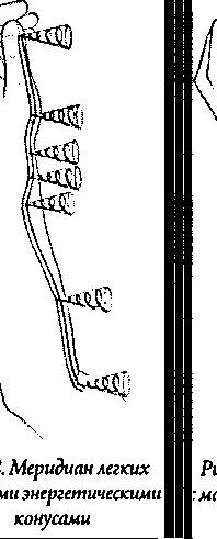 На рисунке 8 изображен меридиан легких, идущий вдоль левой руки. Каждый из малых конусов являет собой акупунктурную точку. Теперь обратите внимание на то, как конусы вкручиваются в меридиан, уходя в самый его центр. Каждая