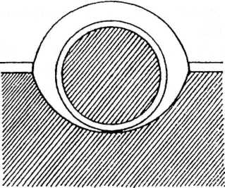 Только Микеланджело мог отважиться на осуществление подобных замыслов. Аркады Дворца консерваторов повторяют тот же мотив в несколько измененной форме. Чтобы обеспечить сильное впечатление контраста во внутренних помещениях здания, Микеланджело сделал формы нижнего зала в высшей степени тяжелыми и массивными. Колонны утоплены в стену. Это не полуколонны, они свободны и округлены, но всей доступной полноты свободы они еще не добились. Половина их тела уже не связана со стеною, остальная часть — в ее плену (рис. 8). Воображению представляется неустанная, беспокойная работа высвобождения.