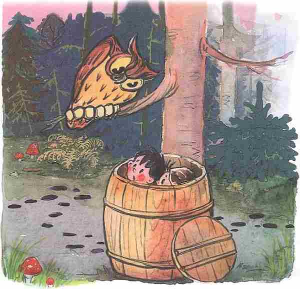 Ребята спрятались в бочку, но Баба-Яга сразу их обнаружила и приказала Филину: