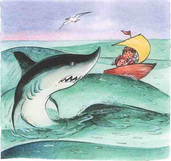 Ваня и Маша почувствовали себя в безопасности, но ненадолго: огромная чёрная Акула вынырнула из воды и погналась за лодкой.