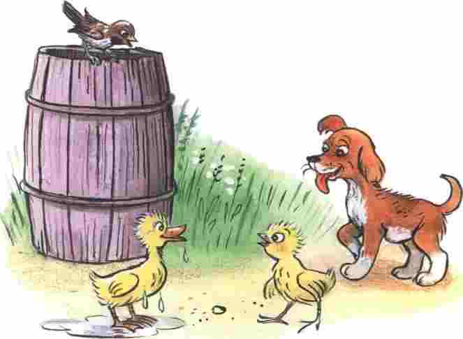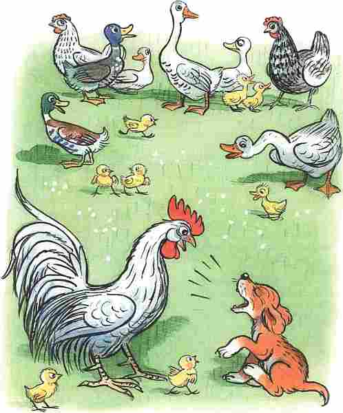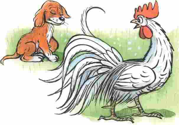 Услыхал Тявка, как петух Кукарекс поёт, и стало ему обидно: «А почему это мы, щенки, так не умеем?» Подошёл щенок к певцу и говорит: