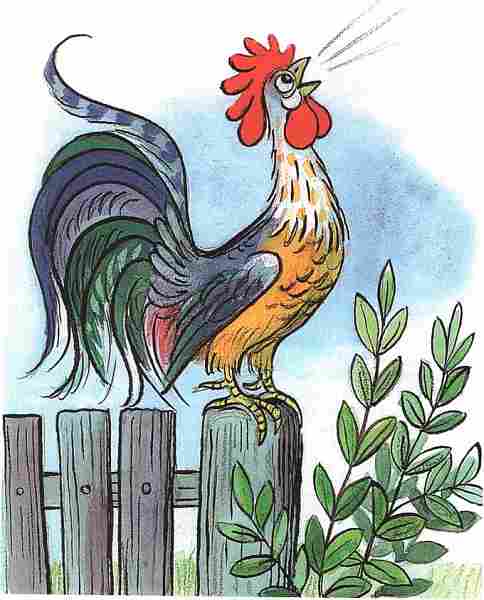 Однажды курочка задумалась, как бы ей вывести цыплят. А в это время петух в жёлтых штанишках взлетел на забор, захлопал золотистыми крыльями и запел: