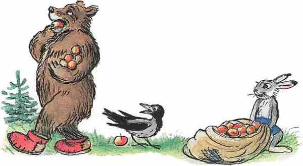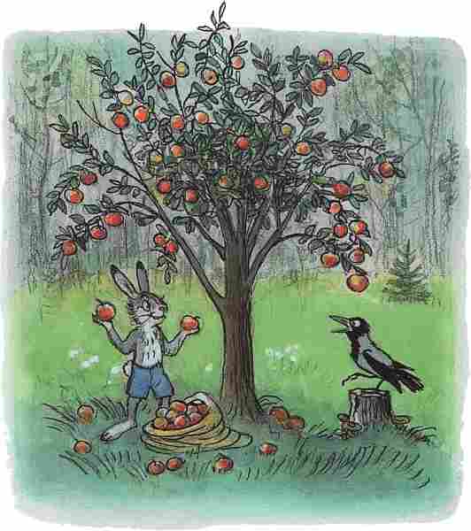 — Напрасно каркаешь, — говорит Заяц, — здесь яблок на весь лес хватит. А у меня зайчата дома голодные сидят.