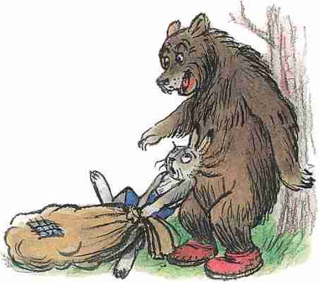 И вдруг голова его уткнулась во что-то мягкое. Поднял голову Заяц и обомлел — перед ним Медведь стоит!