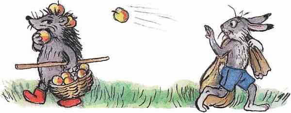 — Ты лучше у меня яблок возьми. Бери, не стесняйся, у меня их много! — сказал Заяц и насыпал Ежу полную корзину яблок.