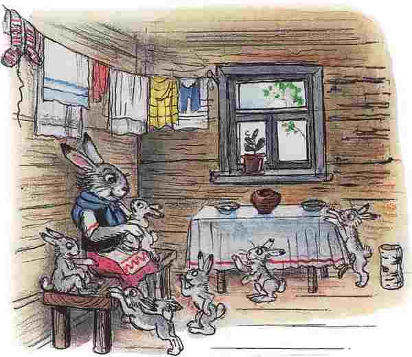 В заячьем домике давно ждут папу-Зайца. Чтобы скоротать время, мама-Зайчиха рассказывает сказку своим голодным зайчатам.