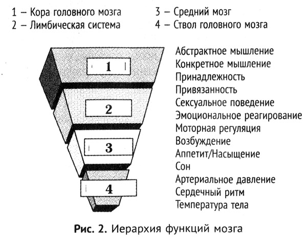 — Мозг организован снизу вверх. Верхняя часть здесь, — я показал на широкое основание перевернутой пирамиды, — это кора головного мозга, самая сложная часть мозга, отвечающая за нашу способность думать и за интеграцию многих наших функций.