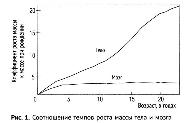 Тело человека растет постепенно, увеличиваясь в размерах приблизительно одинаковыми темпами от рождения до юности. Процесс физического роста мозга зависит от периода развития. Наиболее быстрый рост мозга происходит во время внутриутробного развития до рождения, и в период от рождения до четырех лет мозг продолжает расти крайне быстро. Размер мозга четырехлетнего ребенка составляет 90 % от размеров мозга взрослого человека! Развитие важнейших нервных сетей мозга происходит по большей части именно в это время. Этот период является временем наибольшей пластичности и уязвимости, когда переживаемый опыт активно формирует развивающийся мозг.