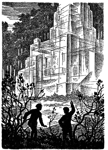 От основного корпуса здания, выдававшегося вперед и вверх безукоризненно ровным кубом, в стороны несколькими уступами спускались боковые крылья здания. Среди взбегавших столбиками и лесенками надстроек сзади высилась ступенчатая башня метров пятнадцати высотой. Я никогда не думал, что, пользуясь лишь одними прямыми линиями и прямыми углами, можно создать такие законченно-гармоничные формы здания. Оно отнюдь не было громоздким, но производило впечатление чего-то грандиозного и монолитного гораздо в большей степени, чем все многоэтажные городские дворцы, которые мне приходилось видеть. Должно быть, оно все было высечено из одного куска этого прозрачного светлого материала. Нигде и намека на спайку или на шов. Окон было мало, вероятно потому, что стены прозрачны. В одной угловой комнате я видел стол и сквозь противоположную стену — несколько расплывчатые очертания деревьев, росших сзади дома. Местами в стенах выделялись непрозрачные, нежно окрашенные полосы.