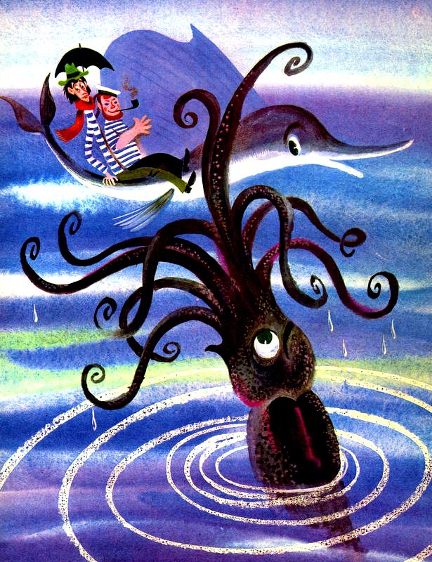Пересели они на морских львов и поплыли дальше. Приплыли к берегу, попрощались, взяли со львов слово, что если они опять в цирке выступать будут, то непременно позовут, и пошли в город Ленинград.