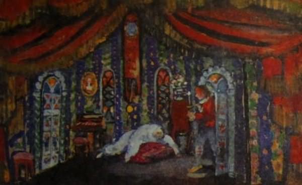 Смерть Пьеро. Эскиз декорации и мизансцены к пантомиме «Шарф Коломбины» А. Шницлера. 1910.