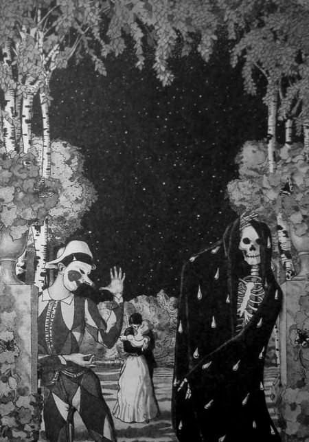 Менее определившийся и самостоятельный, но, может быть, не менее даровитый — Е. Лансере. Он еще мало создал, зато все, за что он принимался, поражает талантом: виньетки пером, архитектурные рисунки, иллюстрации сказок и драм, исторические картины, декоративные панно и карикатуры для сатирических журналов.