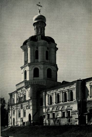 В непосредственном соседстве со Спасским собором, на северо-запад от него, расположен Борисоглебский собор. Он сооружен в 1123 г. черниговским князем Давидом — Глебом Святославичем (ил. 13). Сейчас между Спасским и Борисоглебским соборами свободное пространство, а в древности его не было. В двенадцати метрах западнее собора Спаса археологи обнаружили фундаменты каменного княжеского терема, возведенного, вероятно, во второй половине XII в., а ближе к Борисоглебскому собору — дворцовой постройки XI в. Найденные также обломки штукатурки с фресками, цветная поливная керамика, лекальный кирпич для архитектурных деталей (колонн и т. д.) говорят о том, что эти дворцовые постройки были богато украшены и среди деревянной городской застройки выглядели очень внушительно. Еще немного далее на запад от терема располагались обнаруженные археологами остатки какого-то здания, судя по технике кладки, построенного, вероятно, в конце XI в. и затем разрушенного по неизвестным причинам. Плохо сохранившиеся фундаменты этого сооружения дали повод одним ученым усматривать в них остатки северо-западной части храма, а другим — видеть в них трехкамерный терем. На этих развалинах был возведен Борисоглебский собор, упоминаемый в 1123 г. в связи со смертью Давида Святославича.