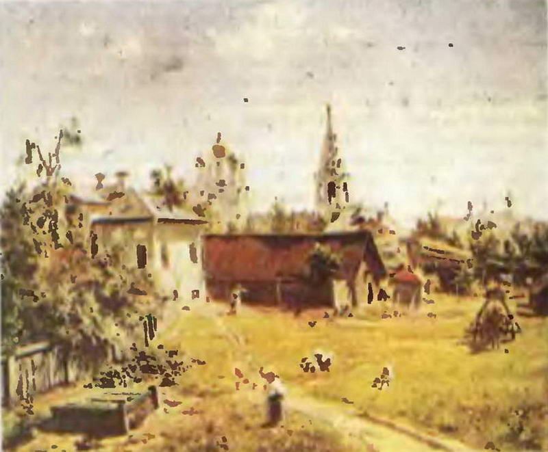Конечно, самого «дворика» уже нет, но церковь, изображенная на заднем плане картины, сохранилась до наших дней, и читатель может увидеть ее в Спасопесковском переулке, выходящем на Арбат. Сейчас храм Спаса Преображения на Песках реставрируется.