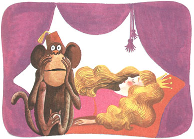 Принцесса, девочка лет семи, лежала в постели очень бледная и грустная. Вот уже сто дней как она не говорила ни слова и ничего не ела, питаясь одним томатным соком, а жизни в ней, видимо, осталось совсем мало.