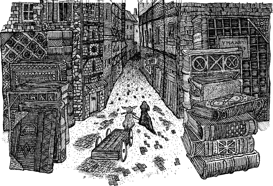 Возбуждающие запахи еды вскоре заставили меня покинуть Рыночную площадь и направиться в Аркады, где я стал рассматривать маленькие витрины лавок. Здесь, в средневековой выложенной камнем галерее со сводом, с потолка которого свешивались многорожковые свечеобразные светильники, даже в плохую погоду можно было бродить, не промочив ноги. И, конечно, здесь у букинистов можно было приобрести ту или иную серьезную старинную книгу. Я увидел издание с плохой печатью Яхудира Оденфатера «Один на улице», бессмертную вымышленную биографию «Натрон Ризе» Фарлика Мильпипротца и галлюцинаторные стихи Вилка Эйла Бами с оригинальными иллюстрациями, уже давно раскупленную «Общую мировую историю» Уолберджа Сэрджлерхта и прямо рядом с ней – полное собрание сочинений Авгоса Люфтбера с автографом – настоящие раритеты и все в безупречном состоянии. Здесь же были лавки, где продавались вырезанные марионетки прекрасной ручной работы и по выгодной цене. Кроме того, предметы антиквариата, связанные, так или иначе, с печатным ремеслом: старинные очки и лупы, вырезанные из книг и помещенные в рамки гравюры, позолоченные закладки для книг, в том числе из тончайшей слоновой кости, дорогие букваримические средства ухода за древними кожаными переплетами, подставки для книг, украшенные богатым орнаментом, пришедшие в негодность деревянные и свинцовые литеры, древние наборные кассы (предположительно из древесины нурнийского дуба) и даже полностью оснащенные старинные печатные машины из чугуна и латуни – нужно иметь с собой туго набитый кошелек, если собираешься в одну из таких лавок. Но будем откровенны: собственно говоря, все эти милые вещицы можно было купить и в антикварных лавках других крупных городов, таких как Гральзунд или Флоринт, и для этого не нужно было ехать в Книгород. Меня переполняло смутное чувство разочарования. Может быть, это была цена за новую популярность Книгорода, за то, что он стал однажды таким же городом, как и многие другие? С таким же променадом, как этот, которые в любом месте выглядят одинаково. Было ли это единственным прогрессом, который произошел за двести лет? Эта крытая лавка сувениров для особо взыскательных покупателей? Где же был старый беспорядочный Книгород с его уникальными предметами старины? Погруженный в эти мысли, я брел дальше, пока не остановился у одной витрины, глядя на которую не сразу понял, что, собственно, в ней было выставлено. Но потом мне стало ясно, что это были книги.