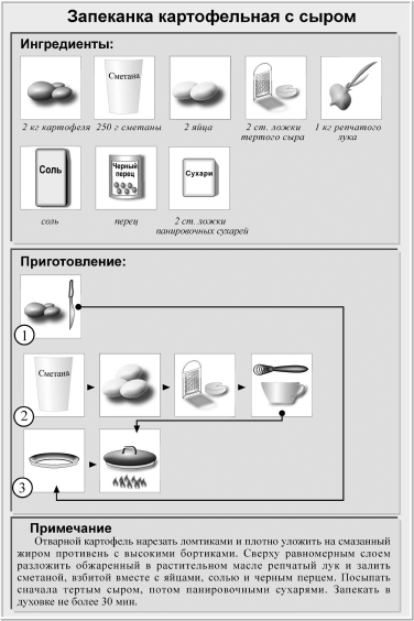 Приготовление: отварной картофель нарезать ломтиками и плотно уложить на смазанный жиром противень с высокими бортиками. Сверху равномерным слоем разложить обжаренный в растительном масле репчатый лук и залить сметаной, взбитой вместе с яйцами, солью и черным перцем. Посыпать сначала тертым сыром, потом панировочными сухарями. Запекать в духовке не более 30 мин.