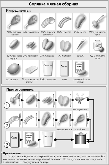 Приготовление: в кипящий мясной бульон положить предварительно спассерованные репчатый лук, огурцы, каперсы, оливки и нарезанные мясные продукты. Довести солянку до кипения, положить лавровый лист, перец горький душистый и продолжать варить при слабом кипении 10 мин. В конце варки добавить соль и сметану, а перед подачей удалить лавровый лист, положить маслины, ломтик лимона без кожицы и посыпать мелко нарезанной зеленью. Не следует варить солянку вместе с маслинами – это ухудшает ее вкус.