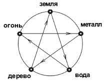 Смысл деструктивных (угнетения) связей противоположен: огонь угнетает (плавит) металл, металл угнетает (режет) дерево, дерево угнетает (подрывает корнями) землю, земля угнетает (впитывает) воду, вода угнетает (тушит) огонь. В этой цепочке противоположные связи оказывают регулирующее действие путем угнетения преобладания одного элемента над другим по так назваемому «циклу звезды» (рис. 7). Созидание и угнетение являются двумя неот» емлимыми свойствами у-син (пяти начал). Без созидания нет угнетения, без угнетения нет баланса и координации процесса созидания. Это утверждение применимо и к взаимосвязям в человеческом организме.