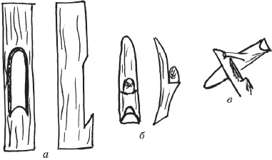 Рис. 17.Окулировка в приклад: а– форма разреза на подвое;б– щиток без листового черешка;в– положение щитка перед вставкой