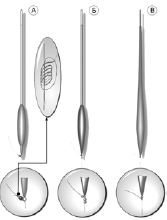 Устойчивость, а значит, и стабильность «работы» поплавка можно повысить, изменив (или изготовив изначально) его так, чтобы центр тяжести конструкции в целом был смещен книзу. Классическим примером может служить «ваглер» (рис. 40), который одинаково чувствителен при поклевках как на погружение, так и на подъем приманки, а скользящие модели обеспечивают эффективную ловлю на значительной глубине, даже если приходится ловить с берега. Этот поплавок не будет «плясать» на волнах и не будет парусить под воздействием ветра, так как леска, зафиксированная под водой у нижнего его конца, гораздо проще «преодолевает» поверхностное натяжение и по воле рыболова может быть погружена под поверхность воды.
