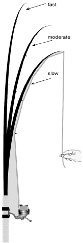 Не менее существенна характеристика спиннинговых удилищ по строю. Строй, жесткость, гибкость, акция бланка в данном случае синонимичны и отражают способность удилища изгибаться в той или иной степени. Так, спиннинги, изгибающиеся по всей длине хлыста, называются параболическими или (от англ. slow) медленными. Удилища среднего (moderate – умеренный) строя изгибаются в верхней половине хлыста. У удилищ жесткого (fast – быстрый) строя гнется только верхняя часть хлыста (рис. 82).