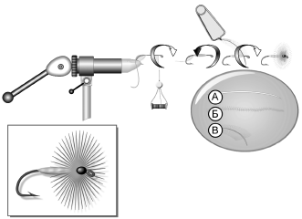 Рис. 149. Принцип вязки простейшей мушки-пушинки (hackle): А– обмотка; Б – даббинг (шелк); В – перышко для ножек