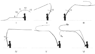 VI. Чтобы муха правильно «села» на воду, необходимо сразу же после выпрямления шнура, в последней фазе заброса, освободить его и одновременно немного приподнять кончик удилища вверх.