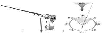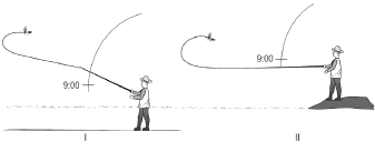 II. Движением руки назад с фиксированным шнуром переводим удилище в позицию на «13.00».
