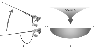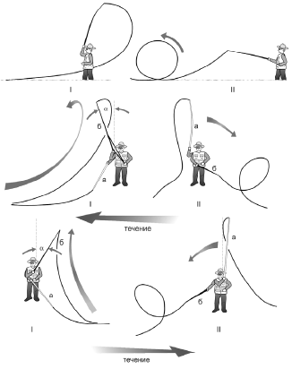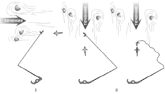 Рис. 162. Варианты применения заброса с вытягиванием шнура: I – заброс поперек течения; II – заброс против течения