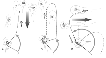 Рис. 164. Виды заброса: А – горизонтальный заброс; Б – заброс с образованием петли («Curve Cast Positive»); В – дуговой заброс («Curve Cast Negative»)