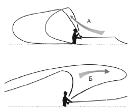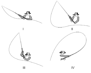 «Spey Cast» используется с левого берега реки. Шнур подтягивается под удилище (рис. 177, I), как и при кольцевом забросе, но петля, образованная шнуром, располагается не за рыболовом, а справа, немного выше против течения. Причем размер петли значительно больше, чем таковой при обычном кольцевом забросе. Практически вырываем из воды весь шнур, и только подлесок скользит по воде. Когда муха находится напротив нас, толкаем удилище вперед, изменяя направление заброса (рис. 177, II). При этом шнур летит уже над удилищем поперек течения. Момент заброса шнура вперед очень важен. Любое опоздание или, напротив, преждевременный взмах удилищем вперед приводит к неудачному забросу.