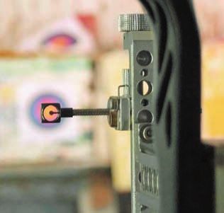 Далее – прицеливание. Целимся правым глазом, левый закрываем. Мушка при прицеливании должна всегда находиться строго слева от тетивы. Мушкой целимся чётко в середину мишени (жёлтый круг на стандартных мишенях).