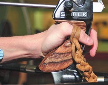 Ещё одной важной частью является «прикладка» правой кисти. Именно от одинаковой «прикладки» зависит кучность стрельбы. Спортсмены прикладывают правую кисть чётко под подбородок ближе к шее. При этом ни в коем случае не костяшкой большого пальца. Большой палец и мизинец не участвуют в тяге тетивы. Некоторые спортсмены закладывают большой палец правой руки за шею, но лично мне известно много лучников, которые в последующем переучивались к прикладке без упора большим пальцем, так как он приводил к определённым ошибкам. Важно также и то, что фиксация тетивы должна происходить в двух точках: в подбородок и в кончик носа. Всё это создаёт нам определённое положение головы, которое мы, при соблюдении всех указанных выше точек соприкосновения, будем повторять от выстрела к выстрелу, что обеспечит хорошую кучность при стрельбе.