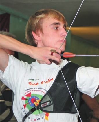 Весь выстрел происходит на полувыдохе, причём вдох перед натяжением тетивы естественный, неглубокий. Во время дотяга правой рукой после прицеливания важно не забывать про упор в левой руке. Часто новички, переключив всё внимание на вытяг правой рукой, забывают, что левой надо как бы выталкивать от себя лук в мишень. Иначе происходит смешение веса тела назад, и левое плечо оказывается выше, чем правое. Если у вас именно такая ошибка и к тому же «злобная» тетива постоянно набивает синяки на левой руке, немного перенесите корпус тела в сторону щита. Следите, чтобы левое плечо не задиралось, а располагалось ниже правого. Этого можно достичь, если изначально перед натяжением тетивы вы как бы втяните мышцы левого плеча вниз (мы говорим о подостной и малой круглой мышце) и не отпустите до самого конца выстрела.