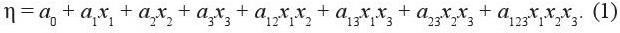 Оси графика соответствуют трем факторам эксперимента, каждая точка плана встречается одинаковое количество раз на гранях латинского гиперкуба. Два уровня для каждого из трех факторов соответствуют минимальным и максимальным значениям, которые для удобства математической обработки кодируются как « – 1» и «+1». Использование 2n– плана (n = 3) позволяет применять регрессионную модель первого порядка для трех переменных. Таким образом, функция отклика, , будет иметь вид (1) с некоторыми коэффициентами ai, требующими определения: