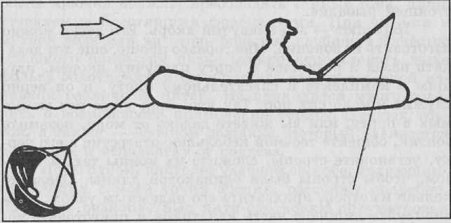 Теперь все зависит от конкретных условий ловли. Когда удите на реке с сильным течением либо при волнении на водоеме вообще без оного, выйдя к нужному месту, опускаете в воду парашют, предварительно привязав его к кодолу за носовое кольцо лодки. Приняв рабочее положение, парашют позволит лодке дрейфовать с одинаковой скоростью. После этого, опять же в зависимости от времени года или суток, а также — вида предполагаемой добычи, прикрепляете к спиннингу нужный самодур. Его скорость движения в воде пропорциональна скорости лодки. Захотите ее увеличить, извлекайте парашют. Либо применяйте запасной, меньшего размера.