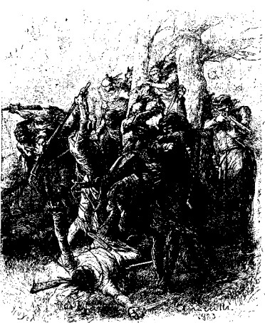 Рукопашная схватка длилась одну минуту. Осажденные поспешно отступали, пока не добрались до противоположного края чащи, где и засели под прикрытием, сражаясь с упорством отчаяния. В эту критическую минуту, когда счастье снова начало изменять делаварам, позади гуронов послышался звук ружейного выстрела, и пуля со свистом вылетела из-за одной из хижин бобров. Вслед за выстрелом послышался страшный, яростный боевой клич.