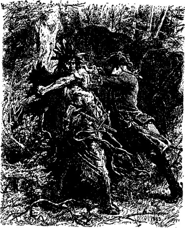 Магуа подал майору свою сумку, по-видимому желая воспользоваться предложением офицера. Их руки встретились; при этом индеец не выказал ни малейшего смущения, и его напряженное внимание не ослабело ни на миг. Но когда он почувствовал, что пальцы Хейворда тихо скользнули по его обнаженному локтю, он отбросил руку майора, пронзительно вскрикнул, увернулся и исчез в чаще. В следующую секунду из-за кустов появилась фигура Чингачгука, раскраска которого придавала индейцу вид скелета. Могикан кинулся за скороходом. Послышались крики Ункаса. Лес озарился вспышкой; вслед за тем прогремел выстрел охотничьей винтовки.