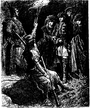 Из темноты вынырнула фигура, похожая на воплощение смерти, остановилась подле разведчика и, взяв горящую головню, осветила ею отдаленный конец узкого грота. Алиса вскрикнула, и даже смелая Кора вскочила при появлении страшного существа. Но Хейворд успокоил молодых девушек, сказав им, что это только их проводник, Чингачгук. Приподняв вторую завесу, индеец показал, что в пещере был еще один выход. Потом, держа в руках пылающую ветвь, он проскользнул через узкий проход в утесе в другой грот, совершенно сходный с первым.
