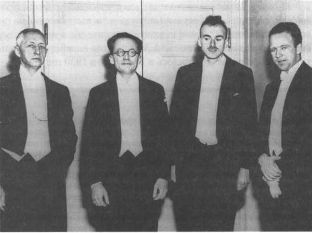 Четыре лауреата Нобелевской премии 1933 года. Слева направо: писатель Иван Бунин и физики Шрёдингер, Дирак и Гейзенберг.