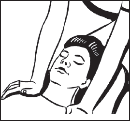 Положите ладонь сбоку на кость черепа. Толкая плечи другой ладонью, как в предыдущем упражнении, в направлении туловища, тяните затылок вбок вращающим движением. Кончиками пальцев массируйте мышцы затылка и шеи, проходя от плеч до основания черепа.