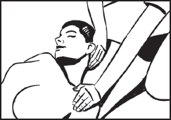 Станьте на колени со стороны головы партнера и положите ладони на верхний край его плеч. При выдохе толкайте его плечи в направлении туловища.