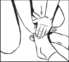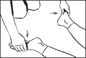 Движение, противоположное вышеописанному. Скрестите стопы партнера. Положите правую руку крестообразно на левую руку. Стоя на коленях, осторожно отжимайте стопы партнера вниз, надавливая вытянутыми руками и используя вес своего тела.