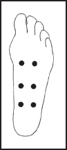 Большими пальцами обеих рук одновременно надавите на шесть точек на поверхности подошвы. Таким образом вы автоматически воздействуете на важнейшие акупрессурные точки стопы. Помните: работать надо, как и прежде, вытянутыми руками, чтобы вес тела мог перемещаться на большие пальцы! Надавливайте при выдохе и отпускайте при вдохе. Специально работайте медленно и найдите свой ритм.