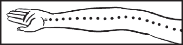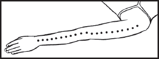 Положите руку партнера на пол перпендикулярно телу. Действуйте так же, как на внутренней линии руки. За растяжением руки и блуждающими нажатиями ладони следует обработка внешней энергетической линии давлением большими пальцами. В заключение для расслабления нужно обязательно еще раз обработать руку блуждающими нажатиями ладони и затем растянуть ее.