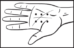 Переплетите пальцы обеих рук с пальцами одной руки партнера таким образом, чтобы свободным оставался только ваш средний палец, а остальными пальцами вы могли бы слегка тянуть его руку вниз. В этом положении одновременно нажимайте большими пальцами на расположенные рядом акупрессурные точки. Затем медленно высвободите свои пальцы и поглаживайте внутреннюю поверхность ладони от запястья к пальцам, слегка надавливая большими пальцами.